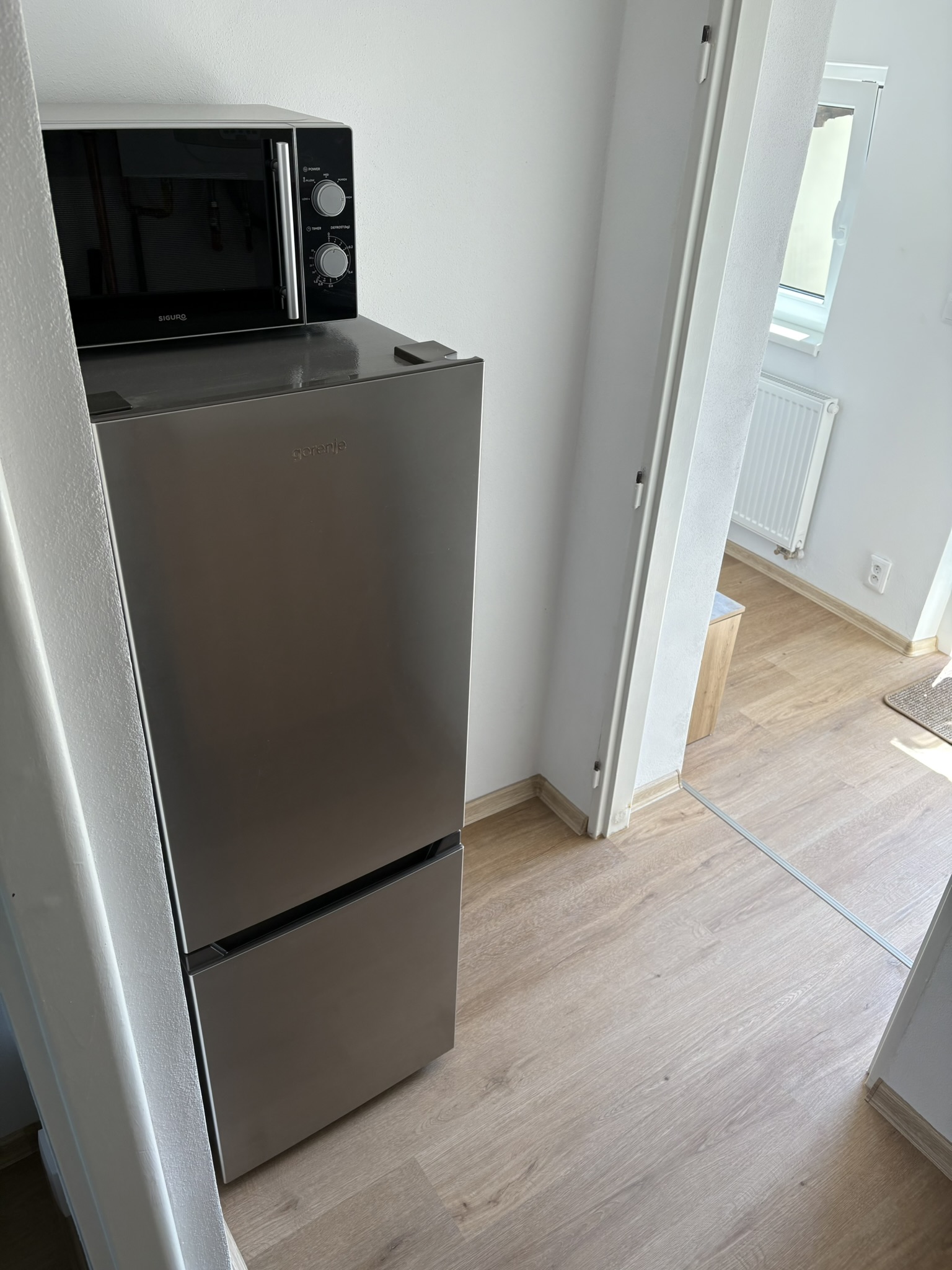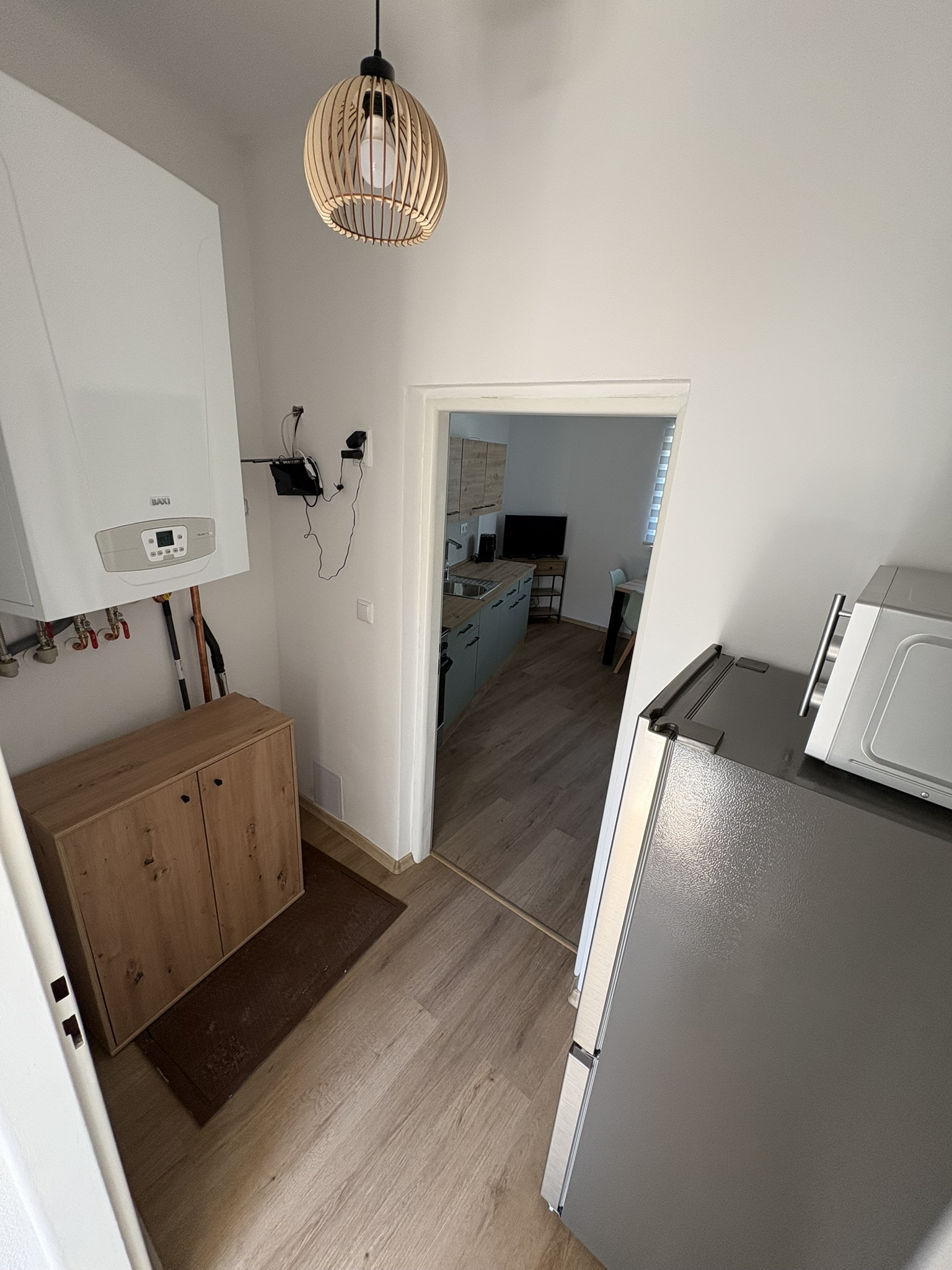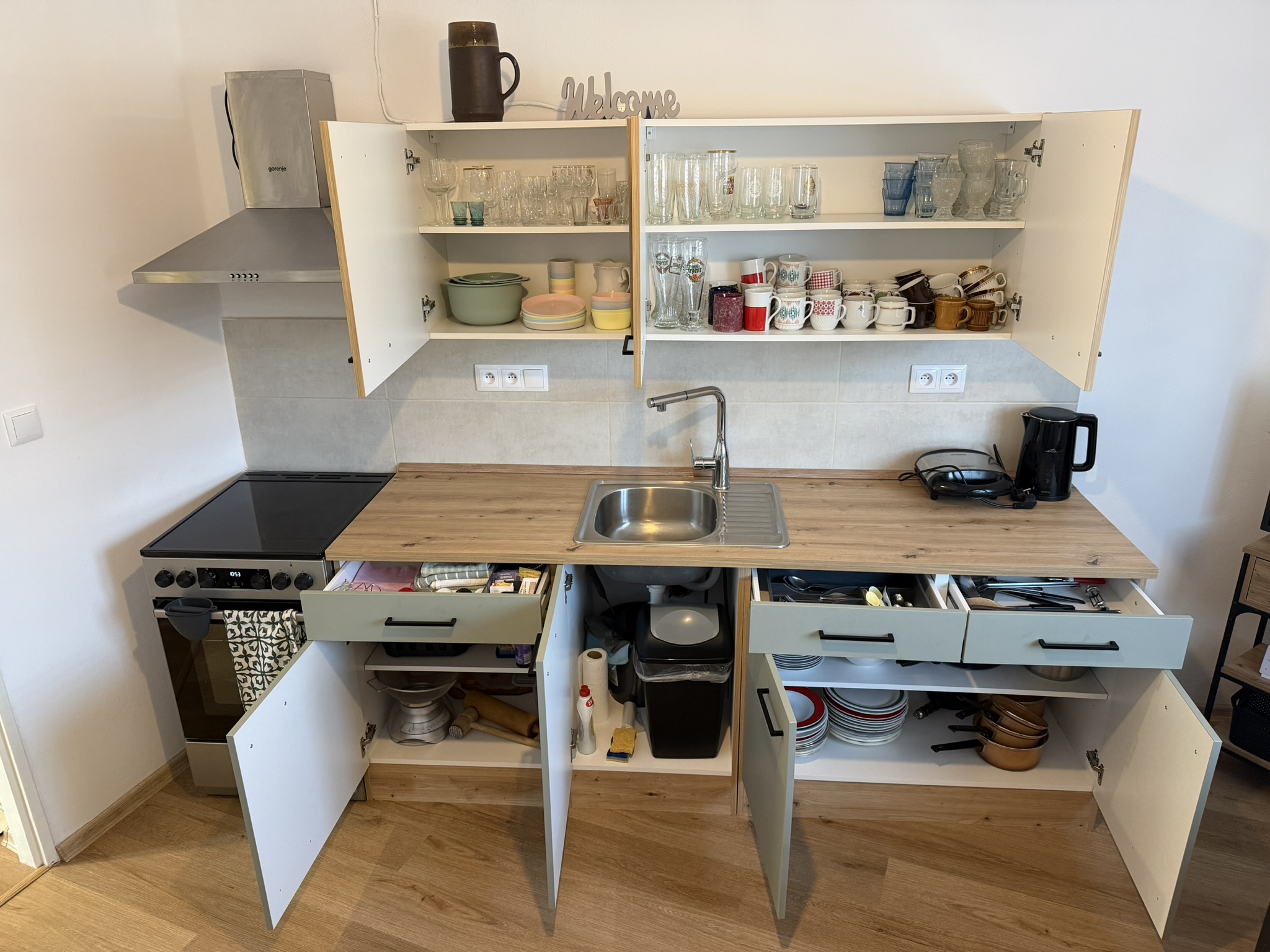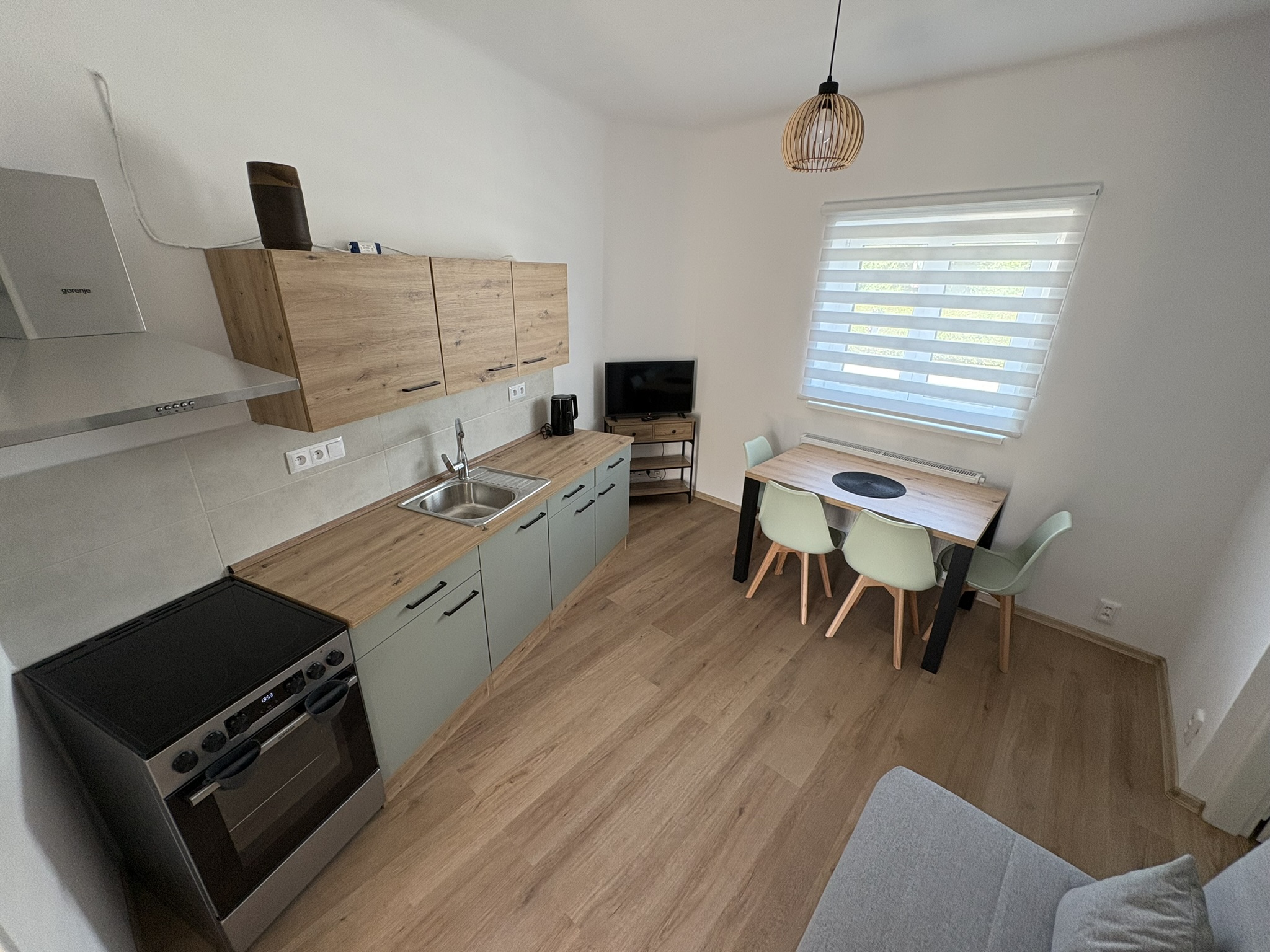 Kuchyň je kompletně vybavená a obsahuje el. sporák se sklokeramickou varnou deskou, lednici, mrazák, varnou konvici, mikrovlnou troubu a toustovač.